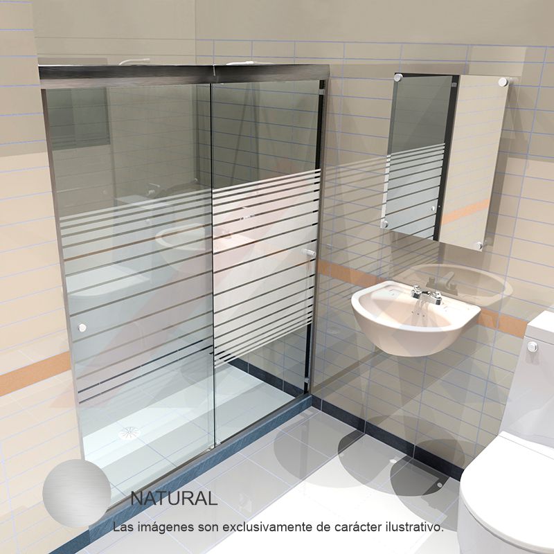 Cancel de baño doble corredizo para cristal templado de 6mm con opción transparente ó serigrafía, y perfiles de aluminio. Medidas de línea: 1.85 x 1.50m 1.85 x 1.80m 2.00 x 1.50m 2.00 x 2.00m