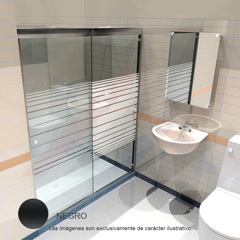 Cancel de baño doble corredizo para cristal templado de 6mm con opción transparente ó serigrafía, y perfiles de aluminio. Medidas de línea: 1.85 x 1.50m 1.85 x 1.80m 2.00 x 1.50m 2.00 x 2.00m